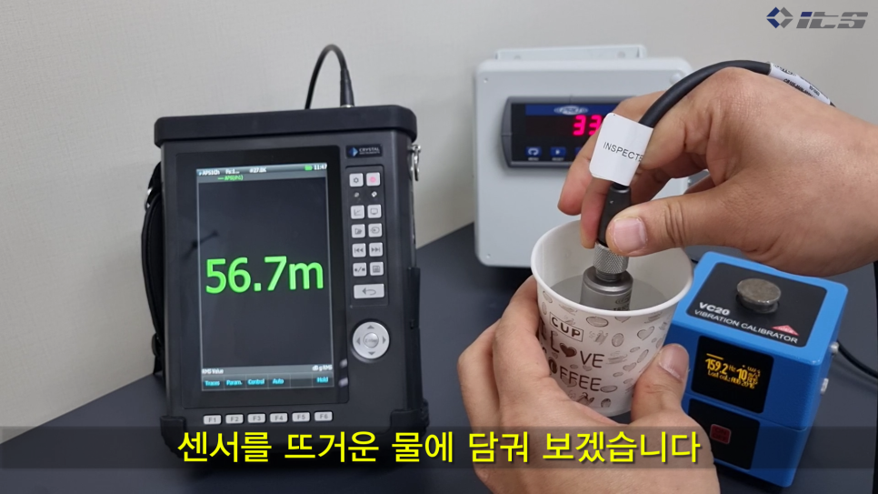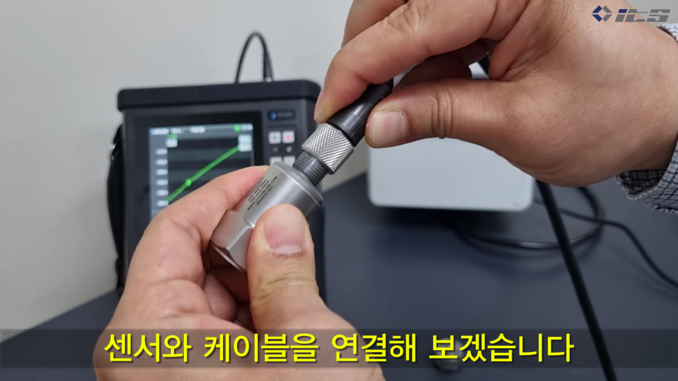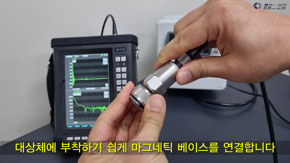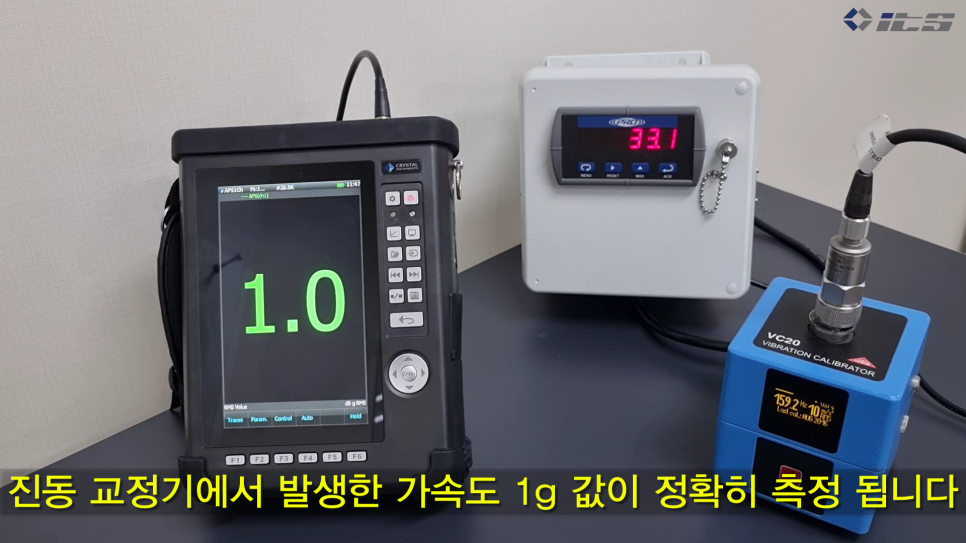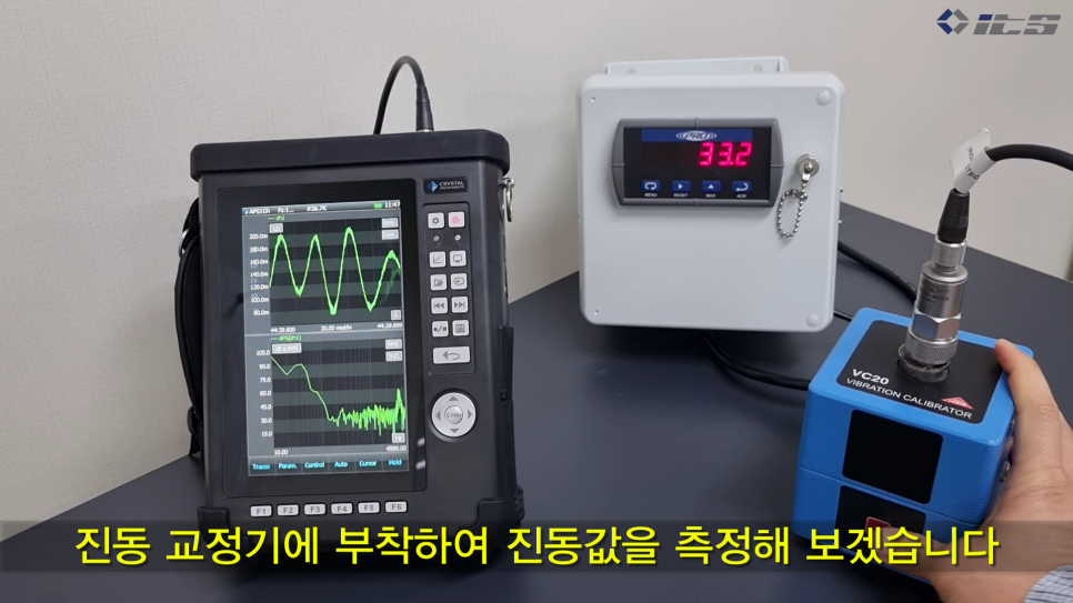 듀얼 출력 진동센서를 진동 교정기에 부착하여 진동을 측정해 보겠습니다.